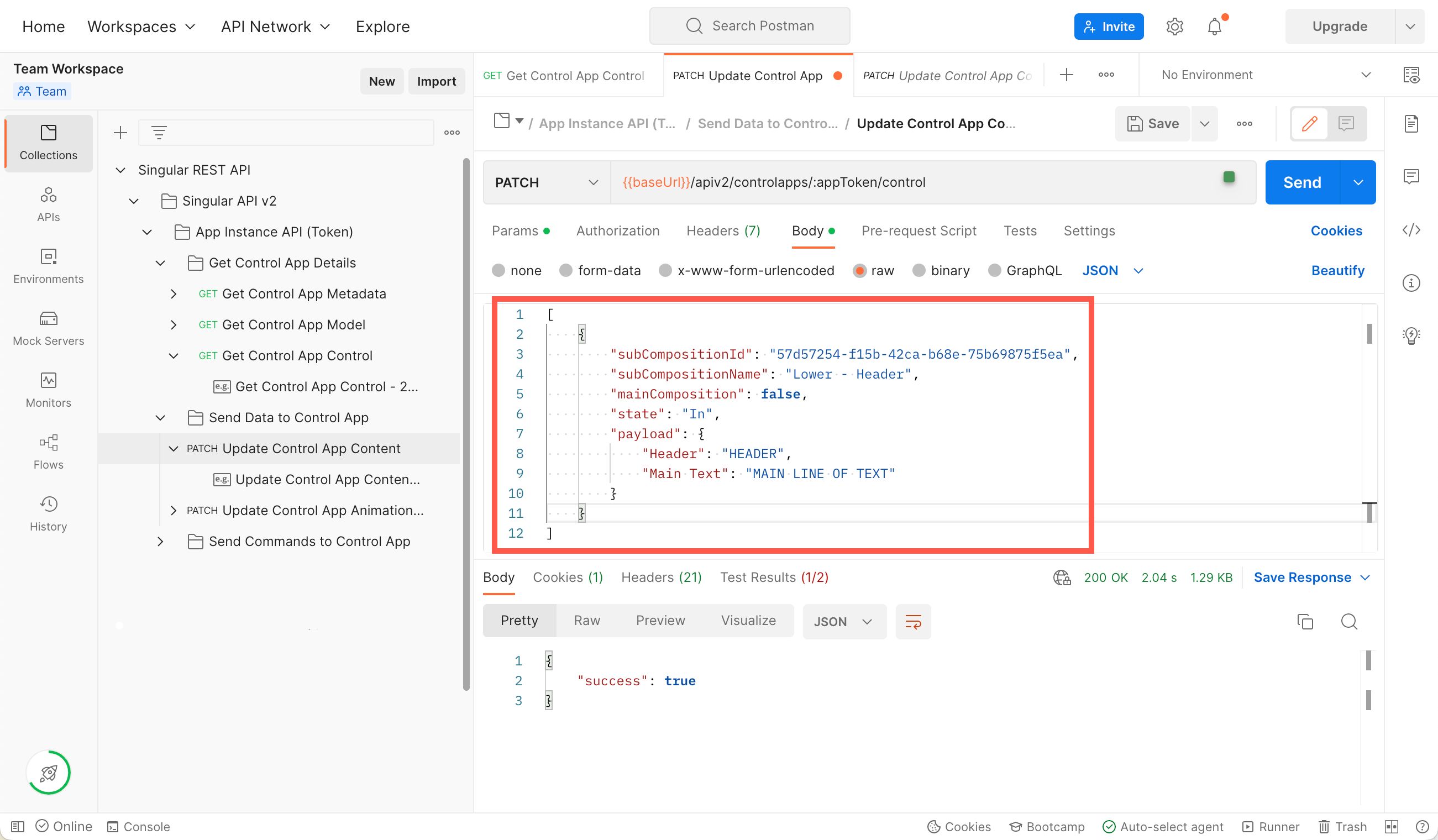 1. Navigate to **Collections** > **Singular REST API** > **Singular API v2** > **App Instance API (Token)** > **Send Data to Control App** >**Update Control App Content**.&#x20;